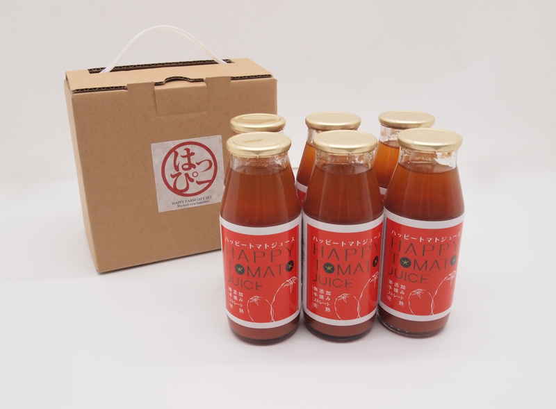 ハッピートマト100%の濃厚なトマトジュース。一口飲むとトマトの香りが口の中に広がります。おいしいトマトで作ったこのジュースをぜひお楽しみ下さい。