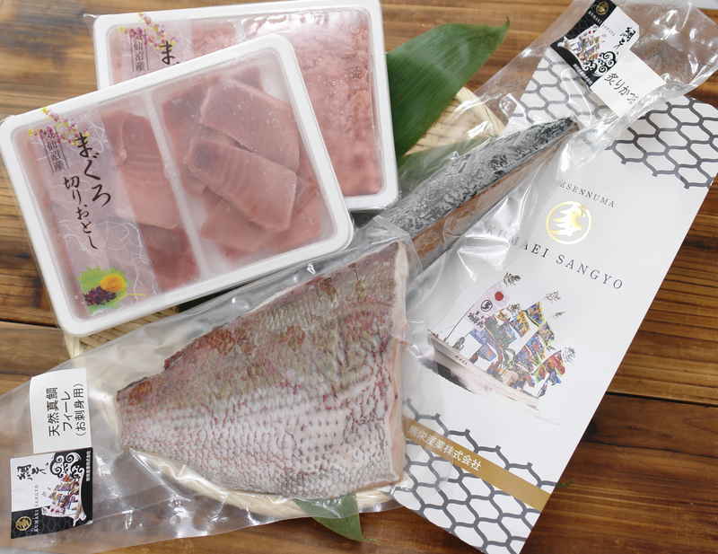 | 内容量 | まぐろ切落し100g×2、まぐろたたき100g×2、炙りかつお×1、真鯛フィーレ×1 |