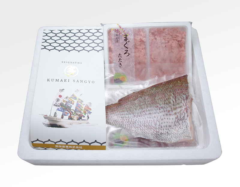 | 原材料名 | 〔まぐろ切落し〕メバチ鮪(宮城県産)/pH調整剤、酸化防止剤(V.C、V.E) 〔まぐろたたき〕メバチ鮪(宮城県産)、キハダ鮪(宮城県産)、食用植物油、水あめ/pH調整剤、酸化防止剤(V.C、V.E) 〔炙りかつお〕カツオ(宮城県産) 〔真鯛フィーレ〕真鯛(宮城県産) |