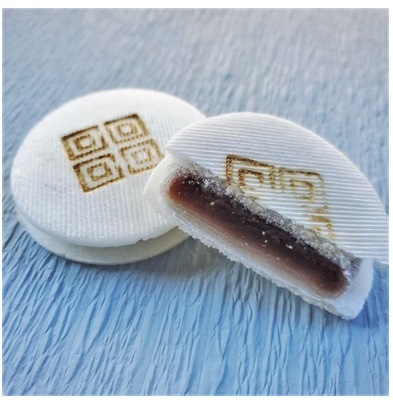 あずきあんを求肥で包み,もなか種ではさみました。外はサクッと、中はもっちり。