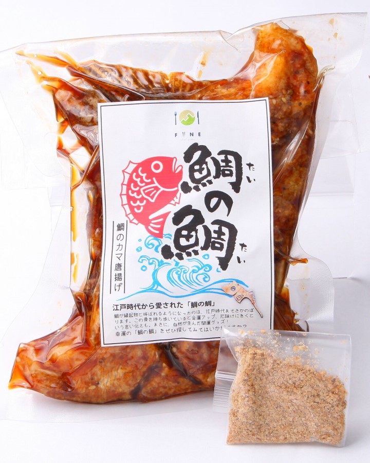 | 原材料名 | 鯛のカマ(愛媛県産)片栗粉、すりごま、香辛料、砂糖、本みりん、酒、濃口しょうゆ、たまり醤油、酢、野菜エキス(玉ねぎ、きのこ、人参、ニンニク)唐揚げパウダー/調味料(アミノ酸等)乳化剤、pH調整剤、パプリカ色素(一部に小麦、大豆、卵、乳成分、鶏肉、胡麻を含む) | ||||
