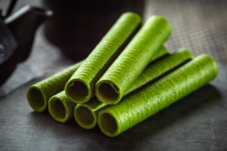 クレープ生地に抹茶チョコレートを敷いてくるくると 甘さ控えめでさくさくとした食感が楽しいロールクッキーです。