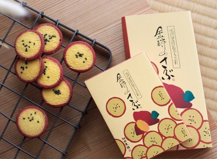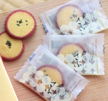 | 原材料 | 小麦粉(国内製造)、マーガリン(乳成分を含む)、砂糖、さつまいも粉末、さつまいもペースト(鳴門金時芋、砂糖)和三盆、ムラサキ芋粉末、食塩、いりごま/着色料(ビートレッド、ココア、クチナシ、カロテン)、香料、乳化剤(大豆由来)、クエン酸 |