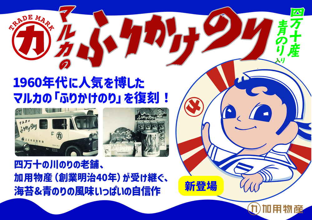 キャラクター「まもる君」復刻版のマルカの四万十青のりが入ったふりかけです。「ゴマとやき塩味」×2袋