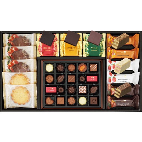 ファンシーチョコレート20個、ミルフィーユ6個、プレーンチョコレート6枚、クッキー5枚