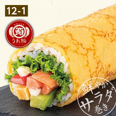 人気のサーモンをアボカドやブルーチーズなどと一緒に玉子で包んだ洋風巻き寿司です。